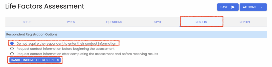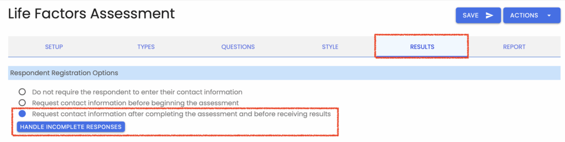 Then click on the “Results” tab at the top of the page. You’ll need to configure your assessment to request contact information from respondents before they begin the assessment. Once you’ve done that, a button titled “Handle Incomplete Responses” will be displayed.