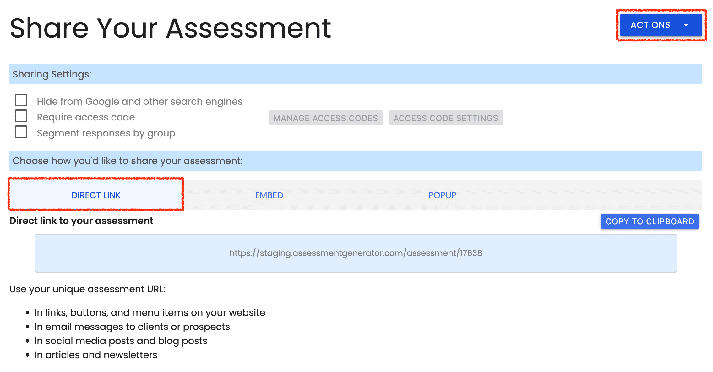 On the “Sharing Your Assessment” page, you’ll see 3 tabs that offer different ways to share your assessment.